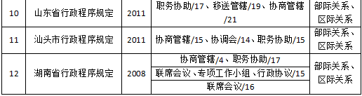 3.行政组织的作用方式是行政行为。国家治理能力的现代化,很重要的是作用方式即行政行为的现代化。这一现代化的任务很多,包括公众参与和电子政务等,尤其是要统一行政程序,把行政行为类型化。行政机关横向关系的行为法机制,是由成百上千的法律、法规、规章和行政规范性文件规定的。这尽管有利于把行为法机制嵌入具体情境,使它具有现实针对性,但却把它碎片化了。在各部法律、法规、规章和行政规范性文件中,我们难以发现和认识行为法机制的整体或概貌。并且,行为法机制的共同要素,如行政机关横向关系的原则,职务协助的条件、范围、经费和责任,行政协议的缔结主体、程序、主要条款和效力,以及联席会议等等,都无法作统一的规定。这样,万一某部法律、法规、规章或行政规范性文件对行政机关的横向关系未作规定,则必将导致无法可依从而互相推诿或扯皮的现象。制度建设过于追求可操作性和生活化,从而陷入琐碎、脱节、冲突的泥潭,导致缺乏可全覆盖的共同规则,已经是我国当前立法的重病。要克服行为法机制碎片化的局限,就必须通过行政行为的类型化及其程序的统一化,制定统一的行政程序法进行整合。行政程序法与单行法中的程序规则,相当于一部法律的总则与分则关系。罗伯特·霍恩等针对 《德国民法典》的总则指出:“它是德国民法学家关于法典应尽可能抽象化观点的典型产物。非专属某一特定法律制度(如买卖契约或劳务契约)的所有规则,都应提出来放在法典的前面,从而赋予它们普遍的适应性。”现在,我国有的地方已经制定行政程序规定,对行为法机制的整合进行了探索 (见表2)。《珠海经济特区横琴新区条例》所规范的内容基本上是组织功能的行为法机制。这些都是制定统一行政程序法的扎实基础和良好经验,因此统一立法的时机已经基本成熟。