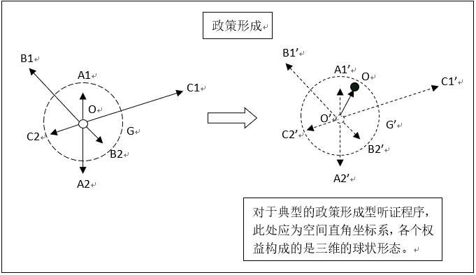 典型的政策形成程序示意图应置于空间直角坐标系中,所涉数方权益可能指向坐标系中的各个方向。如上文所述,所涉争议在进入听证程序之前通常仅为一种相对模糊的基本共识(如政策草案,或仅仅是政策议题),所处理的也为混合的、多中心的问题(以空心原点表示)。通常只有经过充分的意见交换以及其他补充性的程序之后,所涉议题之具体内容才会明晰化(经过听证程序后,空心原点成为命题清晰、内容确定的实心原点)。政策问题的多中心指的是,以这一议题为原点会有不同的利益诉求(A1、A2、B1、B2、C1、C2等),分别形成了数对冲突关系(如A1和A2形成的冲突关系A,以及B冲突、C冲突等)。