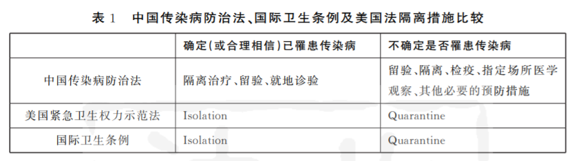 第一,历史发展的原因。在过去的几个世纪直至现代,隔离和检疫被认为系控制传染病的有效方式。两者名称虽然偶有通用,但是使用的条件、法律标准差异迥然。隔离为了治疗,而检疫意在预防和发现。检疫经历了从古代向现代理念的转型,呈现为消极和积极两种样态。前者指虽然检疫但并未采取相应措施,典型如1377年,拉古萨城扣留来自疫区的人30日,后又延至40日,“quarantine”(原为意大利语,40日)一词由此肇始。积极检疫是指为防止疫情扩散而对相关公民进行人道主义区隔,避免社会受到合理预见的威胁。历史上检疫在西方国家声名狼藉,甚至被滥用为不法监禁。但在现代法治理念下,发挥其预防功能而使用检疫一词无疑切中肯綮。