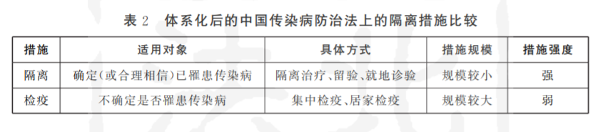 体系化的隔离措施可以针对传染病患者、疑似传染病患者、正常人等展开不同层次和程序的隔离或检疫。这些手段统称为隔离措施,建议英文使用“quarantine”,以便国际交流。而在其之下可分为隔离与检疫两种,检疫的两种方式可明确规定于《传染病防治法》41条。在隔离措施的光谱上,隔离治疗最为严格、最具强制性,规模较小;居家检疫规模较大,强度较弱。留验、集中检疫有时呈现出相互交叉、重叠的特征。就适用对象而言,检疫适用于传染病患者的接触者,而隔离治疗用于传染病患者;对于曾与传染病患者密切接触或疑似被传染者,亦可留验或就地诊验,必要时可集中检疫,一般公民或其他情况可居家检疫。表2可作为参考: