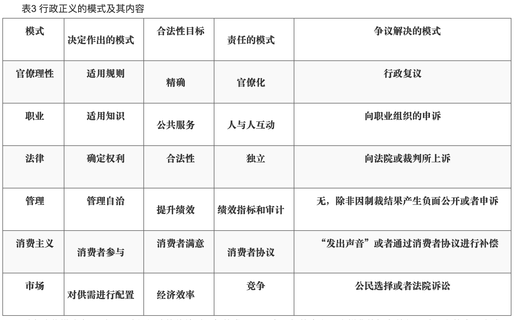行政正义理论的研究在英国大约肇始于上世纪末,1997年英国学界曾专门召开有关行政正义议题的国际会议,用以探讨如何切实促进行政正义的实现。通过文献梳理可以发现英国的行政正义理论来源于美国学者杰瑞·马肖(Jerry Mashaw)有关“官僚正义”的讨论,进而结合新公共管理、以用户为中心的理念对之进行了丰富和拓展,认为其在关注内部机制的时候,亦不能忽视其他的争议解决机制,如基于个人自治、市场化的机制。下表3为英国学者迈克·阿德勒(Michael Adler)基于马肖讨论的基础上提出的几种行政正义的模式。其中,官僚理性模式侧重于政策执行的精确度和效率的问题,然而实践效果并不理想。职业模式是指职业机构服务于其客户的方式,侧重于专业知识,如使用专家向法院提供证据。法律模式关注机构中立,关注合法性和争议的有效解决。管理模式是指使用审计和绩效目标等功能特征。消费主义将公众视为用户并置于中心地位,最为重要的目标就是服务体验和消除不满。市场模式则指由竞争驱动的系统,关注经济效率,鼓励公民自由选择。