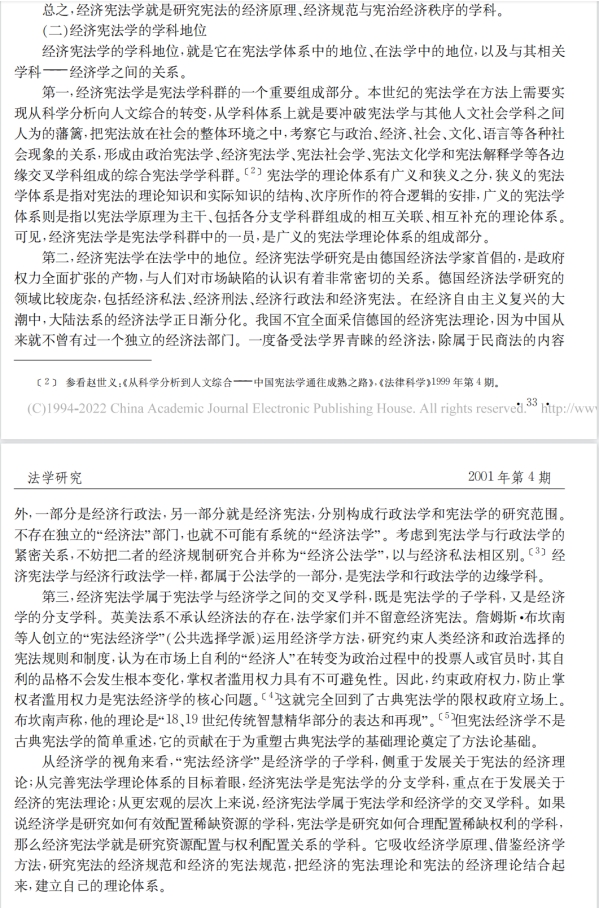 宪法学者赵世义2001年发表《经济宪法学基本问题》(《法学研究》2001年第4期)一文,展示出建立一个结合宪法学属性和经济学属性的的经济宪法学体系的热情,算是宪法学方向上的经济宪法研究在本土的发生。