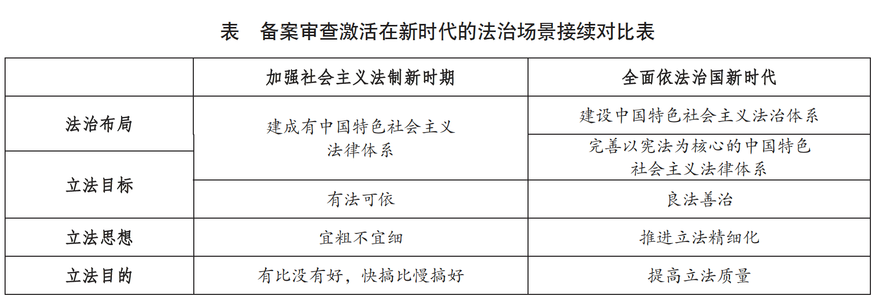 上述四者淋漓尽致地展示出备案审查水到渠成地激活在新时代的法治场景(如下表),法治场景转换间对比鲜明的转换升格,正是备案审查一展宏图的时代契机。