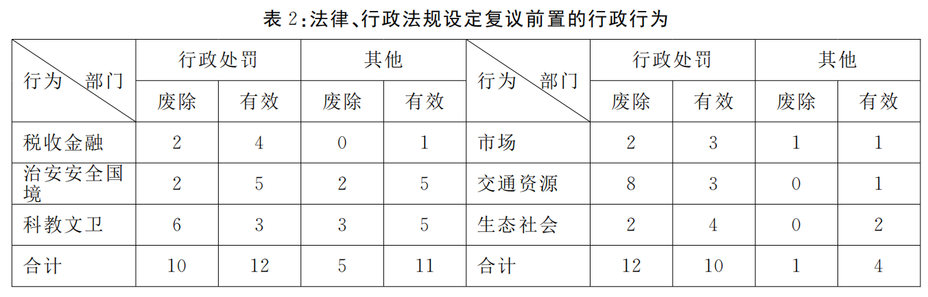 如表2所示,从1980年到现行《行政复议法》的43年间,我国法律、行政法规设定复议前置的行政行为共有65种。其中,已废除28种,占43.1%;仍有效的有37种,占56.9%。由于除了法律、行政法规外地方性法规也有权设定复议前置,我国各地的复议前置实际上远不止65种行政行为。如对前文所述的计划生育行政处罚争议,在25个省级行政区都实行复议前置。又如,《广东省行政事业性收费管理条例》规定对收费争议及行政处罚实行复议前置,《深圳经济特区严厉打击生产、销售假冒伪劣商品违法行为条例》规定了行政处罚争议的复议前置,并且都得到了司法上的支持。
