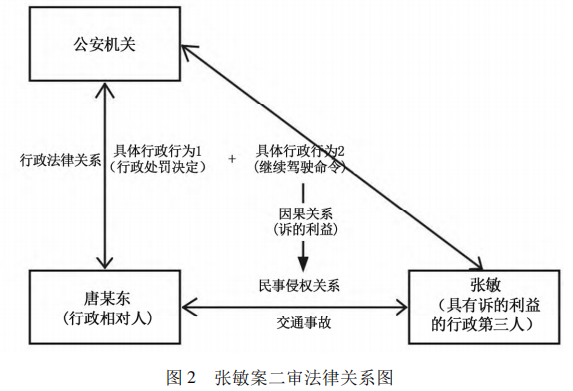 二则,内蒙古自治区通辽市中级人民法院(以下简称“二审法院”)认为交警指令继续驾驶行为属于具体行政行为,该具体行政行为与原告张敏受伤之间存在因果关系,因而有权对此提出行政诉讼。可见,二审法院相比一审法院多考虑了一层法律关系,即交警在对唐某东作出处罚决定后指令其将车继续驾驶至停车场的行为也是一项独立的具体行政行为,通过考虑原告对该行政行为是否具有诉的利益,从而确定诉讼资格。(详见图2)