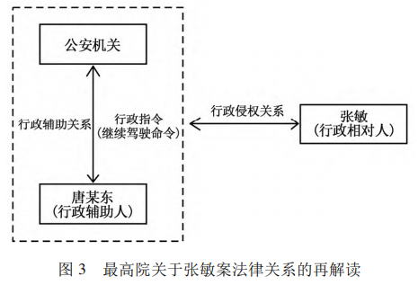 三则,最高人民法院行政庭编写的《中国行政审判案例》对此案又有新的解读,书中“裁判要旨”指出交警指令唐某东驾车前往停车场的行为是“依据行政机关的指示,实施辅助行政机关行使国家职权的行为,他人不服起诉的,属于行政诉讼的受案范围,由作出指示的行政机关承担法律责任”。可见,最高人民法院在二审法院的基础上又更进一步沿着指令行为继续思考受指令所作行为的性质,并将其定义为行政辅助行为,并认为原告张敏的起诉对象并非二审法院所谓的指示行为而是辅助行为本身,但该辅助行为的后果应当归责于作出指示的行政机关,即行政机关作为适格被告。由此可知,唐某东作为被指示人不再是纯粹的私主体,而是不对外承担责任的行政辅助人。(详见图3)
