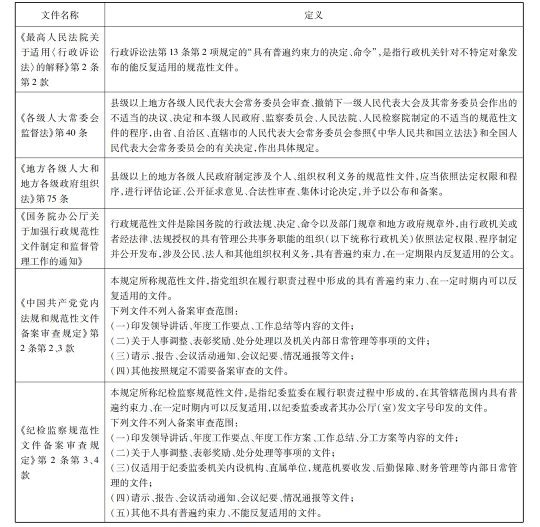 备案审查的对象是规范性文件。党的十八届四中全会决定指出,把所有规范性文件纳入备案审查范围。但目前对规范性文件缺乏统一的定义,导致实践中对哪些文件属于规范性文件理解不一,从而影响了“有件必备”的开展。笔者整理了目前中央层面的立法和文件中对规范性文件的界定,如下表所示: