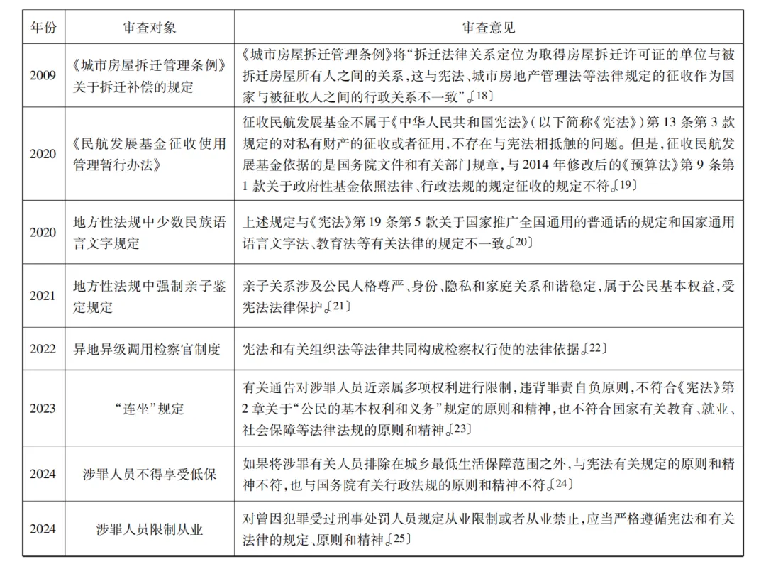 目前主流观点认为,合宪性审查与合法性审查的顺序应当是先合法性审查再合宪性审查,但是也有学者对此质疑。然而实践中,合宪性审查与合法性审查往往呈现出同时进行的局面。比如在目前的11个合宪性审查案例中,有8个案例同时进行了合宪性与合法性审查,如下表所示: