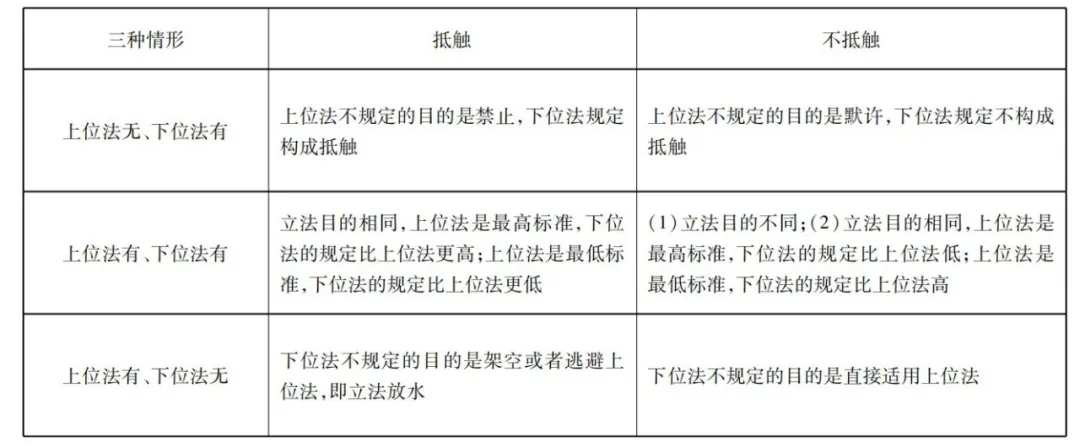 综上所述,笔者将判断上下位法是否构成抵触的实质性评价标准总结如下: