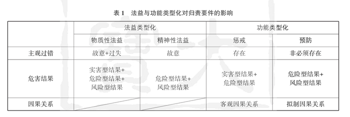 综上,法益与功能类型化对归责要件的影响如表1所示。