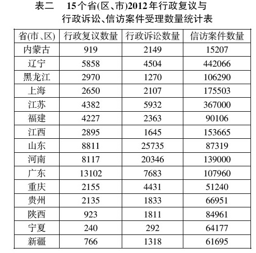 应当承认,从发挥纠纷解决功能的角度来看,目前《行政复议法》关于复议程序的规定与《行政诉讼法》的程序规定相比无疑稍微简单一些,但是,这是否就是行政复议制度功能没有有效发挥的核心原因?我们认为:也不能这样简单下结论。尽管《行政复议法》及其实施条例中关于办理复议案件的程序相对于《行政诉讼法》而言显得简单,但是它毕竟也有申请、受理、审查、听证、时限等最基本的程序性规定,而且现在相当多地方还通过地方性法规、政府规章和规范性文件对行政复议程序已经作了进一步的完善,保证案件正常办理的基本程序可以说是大致完备的。学界和实务界惯常说的一句话是:行政复议具有“方便快捷、方式灵活、成本低廉”的优势,既然如此,行政复议程序比行政诉讼程序简要、灵活应该是顺理成章的,否则,我们怎么能称颂其“方便快捷、方式灵活”的优势呢?更发人深思的现实是:与行政复议制度比较,现在调整信访实践的只有一部作为行政法规的《信访条例》,我国还没有信访法律,相关地方法规和规章很少,现有《信访条例》中关于程序规定的内容要比行政复议法律、法规中的程序规定简单得多;而且,信访机构与行政复议机构相比,司法化程度更低,但是,众所周知,近几年在任何一个地方,信访案件数量都远远多于行政复议案件数量。笔者收集到的2012年15个省(区、市)复议、诉讼和信访情况足可以说明这个问题。(见表二)
