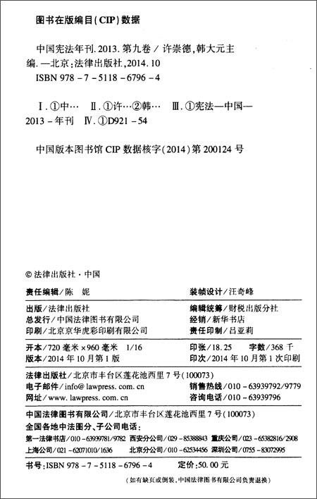 为扩大本刊及作者知识信息交流渠道,本刊已被《中国学术期刊网络出版总库》及CNKI系列数据库收录。为便于查找引用,本刊“2005卷”(2006年出版)序为第一卷,本册即为第九卷。建议引用格式为:许崇德、韩大元主编:《中国宪法年刊》(2013·第九卷),法律出版社2014年版。