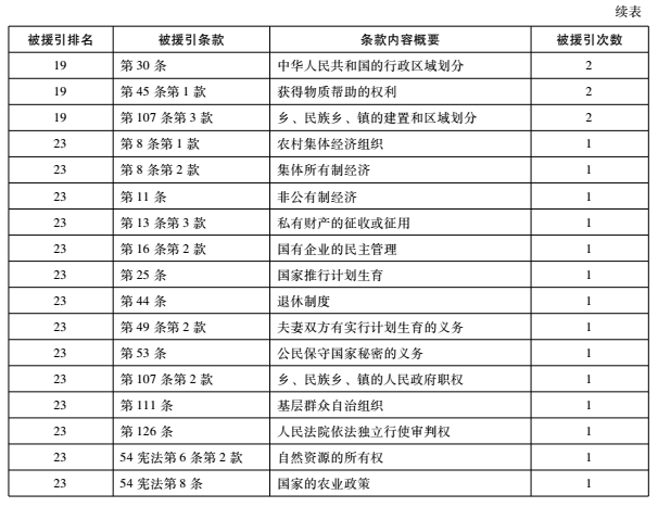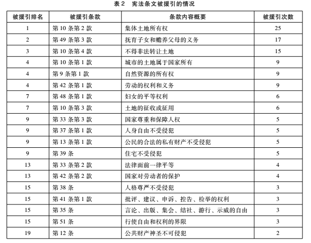 从表2可以看出,宪法条文被援引的次数是不平衡的:有14个条款(在数量上超过被援引条款的三分之一)只被援引了1次;被援引最多的3个条款援引次数总和亦超过总次数的三分之一。