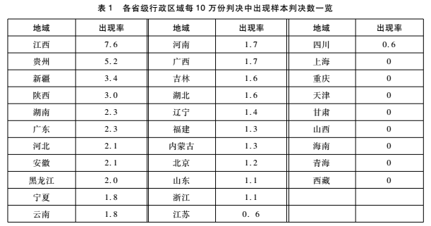 地域信息以省级行政区域为单位。为使数据更加清晰简洁,本文计算了各省级行政区域平均每10万份判决中出现样本判决的频率(以下简称“出现率”),结果如表1所示。可以看到,我国31个省级行政区域的出现率是不平衡的:出现率大于等于3的省份,包括江西、贵州、新疆、陕西,其中江西(7.6)和贵州(5.2)明显高于其他地方;出现率介于0和3之间的省级行政区域,包括湖南、广东、河北、安徽、黑龙江、宁夏、云南、河南、广西、吉林、湖北、辽宁、福建、内蒙古、北京、山东、浙江、江苏、四川;其余8个省级行政区域,没有出现样本判例。