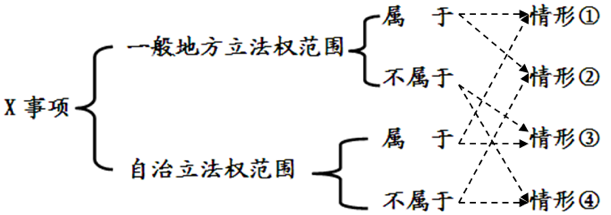 现假设存在某一特定的自治州待立法事项X,则自治州在判断该事项所应当适用的立法权形式时,面临四种可能性(如图一所示)。其中,情形④与一般地方立法权和自治立法权均无关涉,并不存在制定地方立法的空间。因此,下文将着重围绕前三种情形下自治州对两类立法权的选择问题分别展开论证。