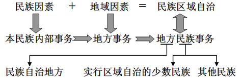 “民族性”是民族自治地方实施区域自治的权源,在规范层面上集中体现为《民族区域自治法》序言第二段中的“本民族内部事务”这一关键概念。其规范内涵的诠释逻辑始于民族区域自治“民族+地域”的双重属性。在民族区域自治建立之初,民族属性占据核心位置,“由某一少数民族的‘上层人士’于特定区域之内统治该少数民族群众的实施格局状态,便形成了‘本民族内部事务’”,因为当时如果没有实行区域自治的少数民族,该自治地方即无法建立,故早先的“本民族内部事务”在内涵上倾向于“实行区域自治的少数民族的内部事务”。后来由于“特定区域”作为民族区域自治的另一构成性要素,其他少数民族在该区域生活的现实与民主改革背景下各族群众一概平等的政法目标相契合,就决定了自治地方各少数民族的“本民族内部事务”管理权均须纳入民族区域自治法制的规制范畴,“本民族内部事务”的由此逐渐转化为“本地方民族事务”:“地方”指特定民族自治地方;“民族”既包括实行区域自治的少数民族,也包括其他民族;“事务”则泛指特指属于本行政区域的具体管理事项。于是“在民族区域自治制度中,民族因素是从属的,主要的因素是区域因素,这样国家与民族自治地方之间的关系更接近于中央政府与地方政府之间的关系,而不是国家与族群社会的关系。”可见,“本民族内部事务”理应包括各民族的内部事务(即民族事务),其中的“各民族”则以居住于特定“地方”为限。这不仅在本质上契合了民族区域自治双重属性中“民族”作为必要条件的地位和价值,亦与纯粹的一般地方事务形成逻辑上的分野。前述逻辑可以图二整合说明: