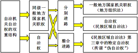 最后,排除标准。根据现行《民族区域自治法》,前述自治权清单中似乎隐含着大量“伪自治权”内容,即“属于民族自治地方自治机关的‘自治权’内容,同样存在一般地方相应国家机关能够行使的权力,主要集中在经济建设、对外贸易、教育、文化、卫生、体育、环保、计划生育、流动人口管理、自然资源管理等经济、社会、文化、民政方面的‘自治权’上”。例如,在《民族区域自治法》第3章中,第25条(地方性经济自主权)、第26条(自主进行经济建设权)、第27条(草原森林管理权)、第28条(自然资源的保护管理权)、第29条(地方基本建设自治权)、第30条(企事业单位自主管理权)、第31条(开展对外贸易权)、第35条(设立金融机构权)、第39条(地方科技发展自主权)、第43条(人口管理权)等,在内容上与一般地方政府事权并无本质区别,这就导致这些所谓的自治权与一般地方事权的界限非常模糊。那么,这些“伪自治权”能否与真正的自治权等量齐观而被直接纳入自治立法权的范畴清单?笔者认为,自治州的这些自治权在内涵和构成上与同级一般地方(如设区的市)所享有的权力并无本质差异,之所以被列举,一方面,在立法目的上可解释为立法者对民族自治地方同样享有这些权力的法律地位的宣示和强调;另一方面,在作为权力主体的自治州所享有的国家权力结构上,这些自治权本身并不违背《民族区域自治法》第4条第2款“自治州的自治机关行使下设区、县的市的地方国家机关的职权,同时行使自治权”的规定,只是前款的一般地方国家机关职权属性和民族自治地方自治机关职权属性在实践中通常以相对独立的二元规范形态分别呈现,而在这些所谓的“伪自治权”上则以“一权两性”的一元规范形态呈现(参见图三)。由此,这类“自治权”的规范制定过程应被理解为兼涉一般地方立法权和自治立法权的情形(即情形①),而不宜作为纯粹的自治立法权事项(即情形③)理解,而自治州本身也就基于立法实践的便宜性而具有相应的具体立法形式的选择空间。