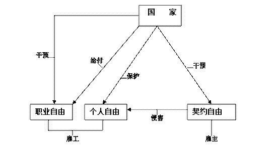 如图所示,职业自由在劳动权的构造处于前提的地位。因为公民若不选择某种职业,则宪法上的劳动权与他无关。当公民选择某种职业后,其与国家之间即产生三重法律关系:一是国家对公民职业自由的干预关系。国家对职业自由的干预,典型的莫过于国家规定的某种职业资格和准入条件。例如《娱乐场所管理条例》规定犯有特定种类犯罪的人不得在娱乐场所内从业,此即公权力对职业自由的干预。二是国家对公民职业自由的给付关系。宪法第42条规定,“国家通过各种途径,创造就业条件……国家对就业前的公民进行必要的劳动就业训练”。获得就业是职业自由的前提,而就业训练则是为了雇工更好地行使其职业自由。在这个层面,国家的目的不是去限制职业自由,而是创造条件更好地满足雇工的职业自由。三是国家对雇工个人自由的保护关系。当公民选择某种职业后,他的个人自由往往会受到雇主的不当侵害,因为雇主会要求公民放弃某种个人自由以获得工作机会。此时国家的任务在于积极介入雇主和雇工之间的契约关系,限制雇主的契约自由,保护雇工的个人自由。