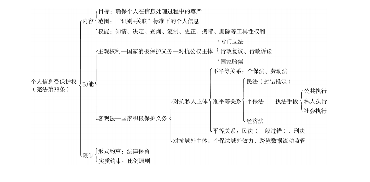 自2000年全国人大常委会《关于维护互联网安全的决定》以降,我国的个人信息保护法律制度已发展二十余载,形成了一套横跨民法、行政法、刑法、经济法、劳动法等部门法的规范体系。其中,《民法典》首次从民事基本法的高度确认个人信息受法律保护,历史意义非凡。民法学者多年的深入讨论和扎实积累,也为推动我国个人信息保护法制发展做出了不可磨灭的贡献。然而,以民事权利为个人信息保护法律体系概念基础的主流观点,在理论和实践上都值得反思,民事权利难以独担统率我国个人信息保护法律体系之重任。因此,有必要将视野提升至宪法层面,以域外经验为镜鉴,重新解释我国《宪法》第38条,发现作为基本权利的个人信息受保护权。较之民事权利基础论,以宪法上的个人信息受保护权为概念基础,对建构我国个人信息保护法律体系具有三方面的优化意义。第一,厚基础,即作为基本权利的个人信息受保护权可以为民法、行政法、刑法等具体领域的个人信息权益提供宪法依托;第二,全覆盖,即个人信息受保护权的主观权利和客观法面向要求国家承担消极与积极保护义务,由此能充分覆盖各类个人信息侵害风险源;第三,规范化,即基本权利间接第三人效力、不足禁止、功能适当、法律保留、比例原则等宪法教义,能为进一步完善个人信息保护法律制度和实践提供规范指引。总之,以宪法上个人信息受保护权为基础,能建构出一套基础更稳固、内容更完整、结构更合理的个人信息保护法律体系。该体系可由下图来直观展示: