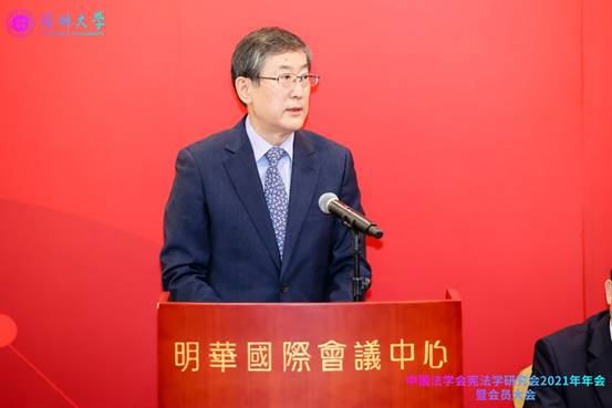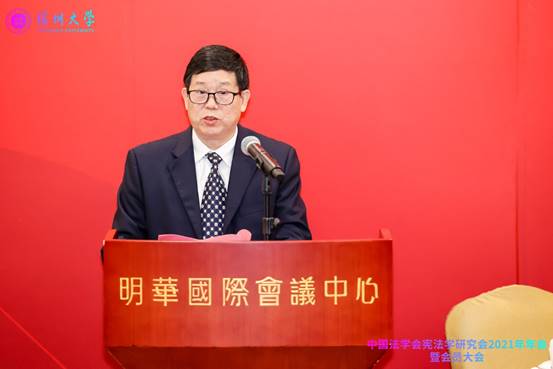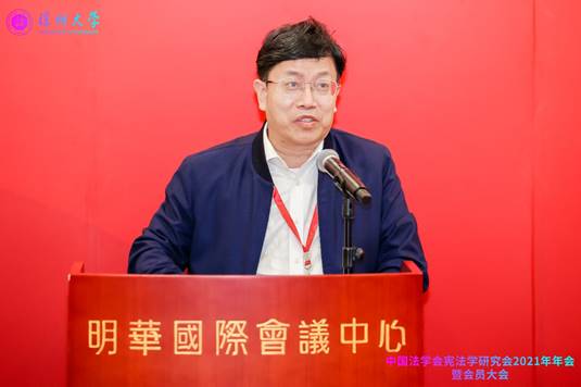 中国法学会党组成员、副会长王其江发表讲话。他代表中国法学会对本次年会的召开表示热烈祝贺,向与会代表致以诚挚问候。他表示,今年是中国共产党成立100周年,习近平总书记“七一”重要讲话全面回顾了我们党百年来领导各族人民不懈奋斗的光辉历史,科学展望了百年未有之大变局下中国发展的光明前景,是推进中国特色社会主义伟大事业和党的建设新的伟大工程的纲领性文献。宪法学研究会将年会主题确定为“中国共产党与中国特色社会主义宪法道路”,是深入学习贯彻总书记“七一”重要讲话精神和党史学习教育要求、深入学习贯彻习近平法治思想的具体行动。王其江副会长强调,宪法与中国共产党百年历史息息相关、紧密相连,要充分认识宪法在实现中华民族伟大复兴中的重大意义。五年来,宪法学研究会积极服务党和国家工作大局,各项工作成效显著:坚持正确政治方向,充分发挥党建引领作用;高水平常态化举办学术活动,取得丰硕成果;培育优秀青年学者,加强人才队伍建设;围绕党和国家工作重心,主动发挥智库功能;积极开展对外学术交流,提升国际话语权。王其江副会长要求,要坚持以习近平法治思想为指导繁荣发展中国宪法学研究事业,广大宪法学者要切实增强责任感、使命感,加强宪法学研究会建设,努力繁荣发展宪法学研究事业,为推进全面依法治国、建设社会主义现代化强国作出更大贡献,要始终坚持党对研究会工作的领导,深入学习研究宣传阐释习近平法治思想,积极构建中国特色社会主义宪法理论和话语体系。王其江副会长指出,本次年会的举办恰逢其时、意义深远,希望将要选举产生新一届理事会、常务理事会和负责人在中国法学会领导下,严格依法、依规、依章程做好各项工作。