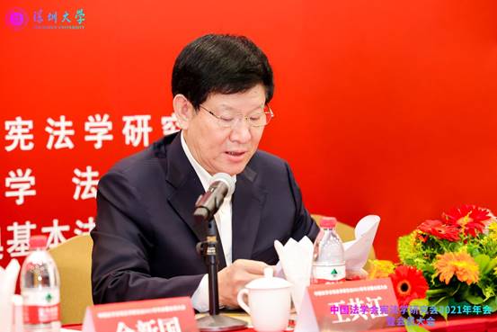 在中国法学会宪法学研究会2021年年会暨会员大会的闭幕式上,新当选的中国法学会宪法学研究会会长郑淑娜发表讲话。
