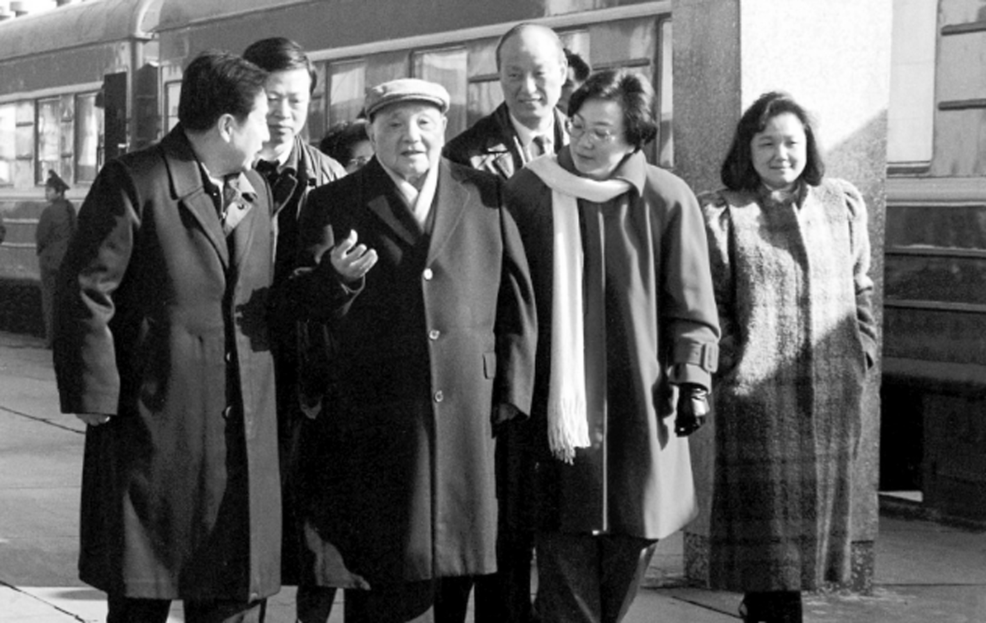 (1992年1月18日, 邓小平同志南巡途经湖北武昌时, 与时任湖北省委书记关广富、省长郭树言等一起交谈。)