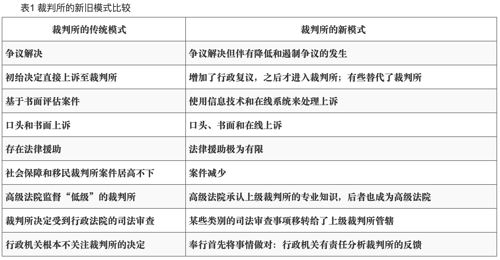 英国裁判所建立之后,当时的学者如罗布森(William Robson)、首席大法官休厄特以及其他许多法律人坚持将其定位为外部监督者,虽然多诺莫尔委员会并未将其在司法、准司法、行政职能之间作出清晰界分,但在该报告基础形成的弗兰克斯报告明确了法院系政府的外部监督者,裁判所构成了司法程序的一部分。不过在实践中,英国人仍然将裁判所与美国独立规制机构内部裁决的运作方式相等同,同相关的政府部门继续保持密切的关联。里盖特报告以及此后的改革继续、明确地将裁判所定位为外部监督者,司法化改革使得裁判所的运作与法院的运作越来越类似。众所周知,相比于法院,裁判所制度一直以来因其迅速、低成本和便捷等优势,成为英国挑战行政决定的主要渠道,且蜚声海内外。裁判所可以全面审查一项诉求的优劣,与一线的行政初始决定者相比,其裁决标准和质量相对较高,公众对之颇为信赖。裁判所较少对抗性,因而对于法律救助方面的资金需求也并不高;裁判所程序非正式,证据规则简便易行,给人一种亲和而友好的形象。然而,司法化的趋势导致裁判所固有的优势荡然无存,甚至有学者质疑司法化并不一定是正确的方向,可能构成了“复杂而模糊的设计”。将裁判所改造成为法院,模糊了两者之间的差异,司法化的程序将限制当事人有效参与救济过程,正式的平等可能会成为实质不平衡的掩盖。2011年,作为管理裁判所的“行政正义与裁判所委员会”(Administrative Justice and Tribunals Council, AJTC)发出警告认为英国的行政正义体系正在面临着极度危险。