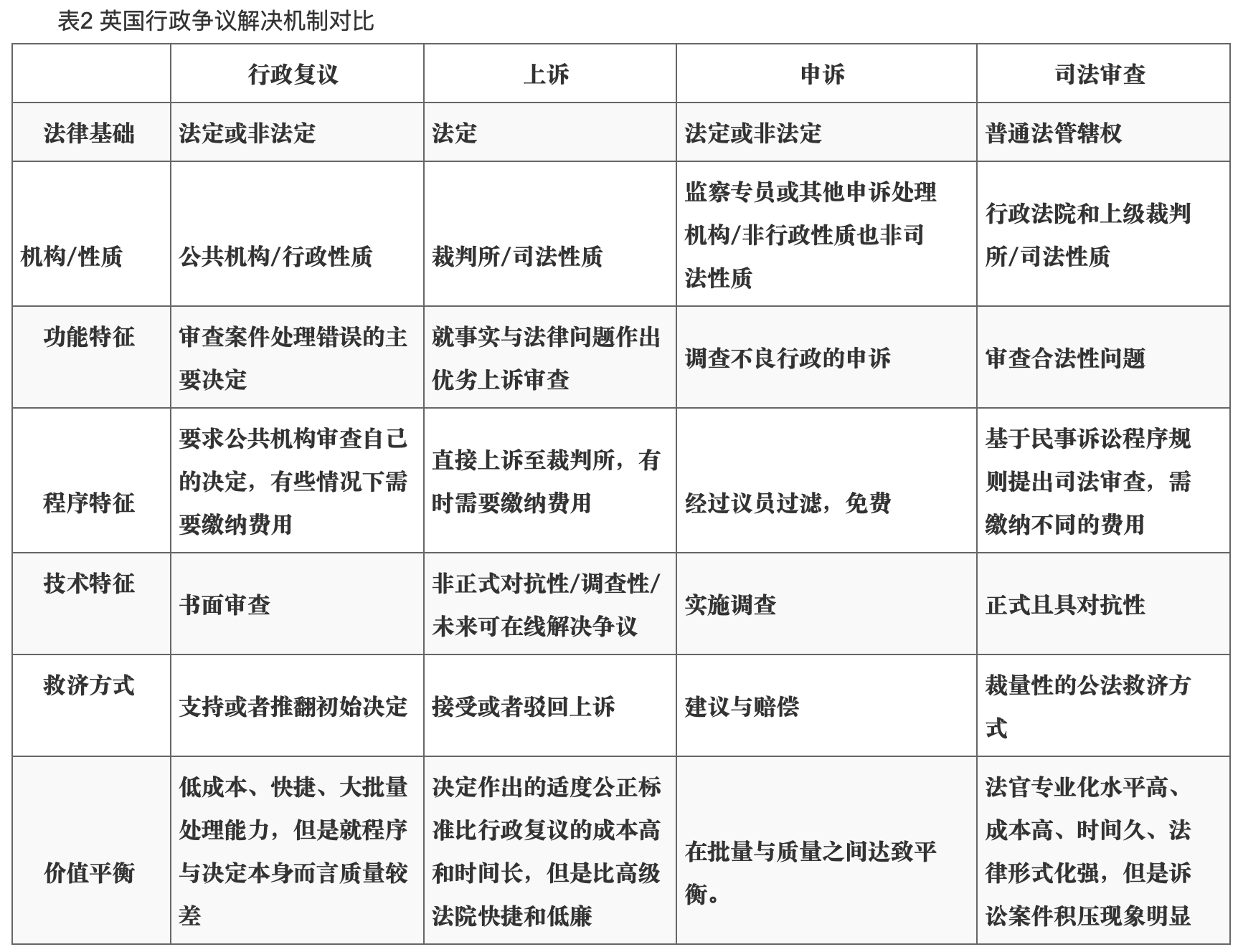 如今英国的司法审查快速发展,以至于学者断言英国宪法已经从议会主权移转为更为平衡的体系,在其中议会主权和法院构成了平衡的双极。不过,司法审查仅仅关注法律问题,仅对行政决定的合法性(legality)实施审查,并不关注正确性或者优劣问题(merits),且程序繁琐冗长、费时耗力。在行政争议解决机制的设计层面,英国人从来没有仅仅拘泥于法院系统,为寻找实现行政正义的最佳方式而不断展开探索,并同时关注可获得性、适当性、有效性等价值的实现。