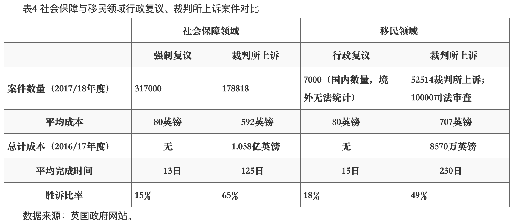 英国《移民法》第15节明确规定了行政复议的要求,内政部解释此规定的目的在于“解决案件工作错误而确立的适当的、低成本机制”,为此专门颁布了移民行政复议规则。这意味着该部每年只有12%的行政决定进入到了裁判所的上诉阶段,极大地提高了效率并节省财政开支。不过,对于公正的考量,一直是各界关注的问题。内政部则认为裁判所的拖延、成本对申请者本身就是不公正的,而法官则认为向法院提出上诉是最为重要和根本的权利。妥协的结果是涉及基本权利的事项保留了上诉权,其他则由行政复议加以审查。内政部保证行政复议制度的承担必须是训练有素且经验丰富的职员,且独立于初始决定者;建立反馈机制,并对相关问题展开调查。不过,这些承诺在行政实务中大多都未能兑现。对行政复议制度并无外部持续的监督,边境和移民独立检察官有时会不定期公布运作报告。最新的报告指出从事行政复议的职员多为低层级、未经过训练甚至是临时雇用人员。内政部的回应是应当加以修改,但是效果并不佳。同时,在未有上诉权的情况下,当事人不服复议决定仅能诉诸司法审查,但司法审查的救济效率远不如上诉审,同时也导致司法审查案件积压激增。下表4为社会保障和移民领域行政复议、裁判所上诉案件数量、成本、完成时间以及胜诉比率的对比统计。