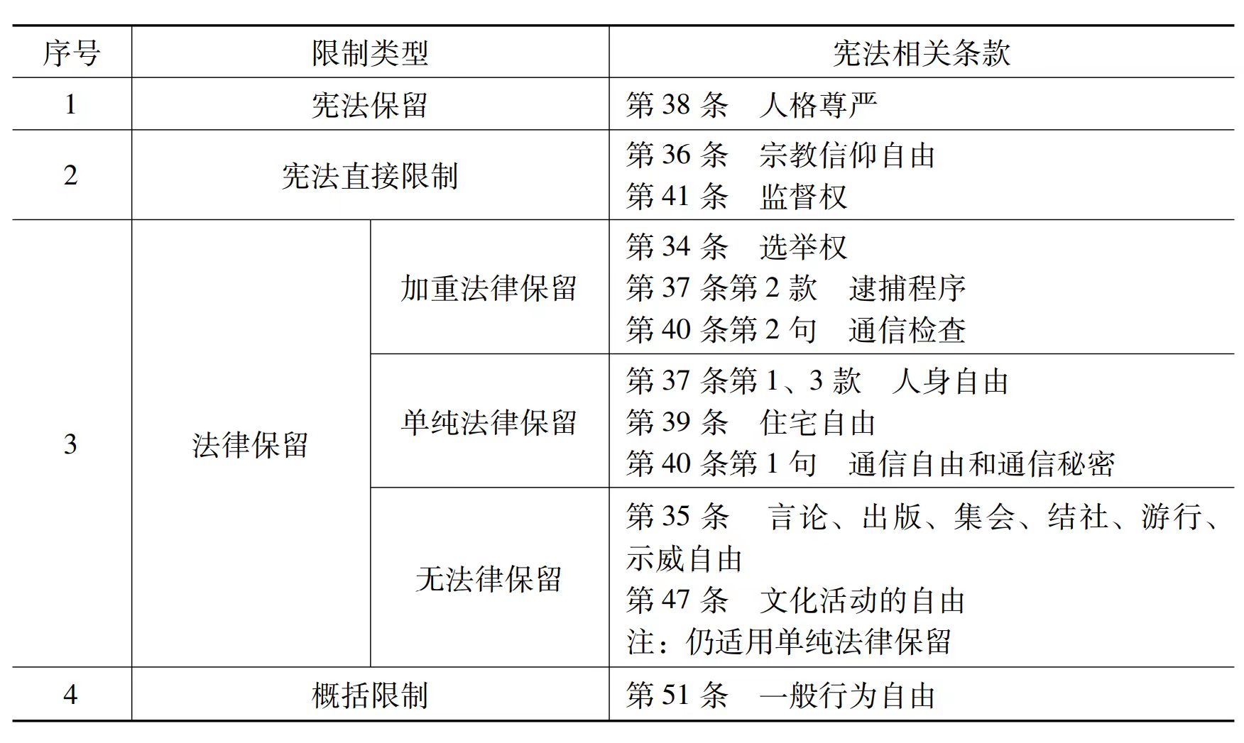 上表显示我国宪法对基本权利的限制呈现出区别化和层级化的特点。所谓区别化,是指宪法基于基本权利的不同属性而设置不同类型和强度的限制,也即“并非一切自由及权利均无分轩轾受宪法毫无差别之保障”之意。所谓层级化,是指就基本权利的限制而言,宪法分设宪法保留、宪法直接限制、法律保留和概括限制等多种类型,立法机关的形成自由在概括限制模式中最大,而在宪法保留中则几无立法介入之余地,其形成自由随着保留程度的增加而逐级递减,因此呈现出层级化的外观。