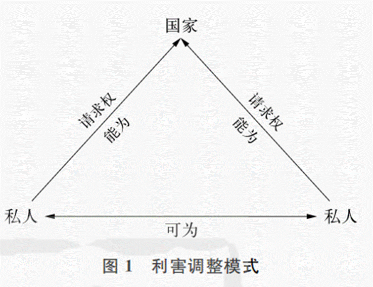 利害调整模式大体上借鉴了格奥格·耶利内克对于可为与能为的区分。耶利内克认为,可为是法秩序允许私人意志在特定方面行使其可触及他人领域的、涉法的自然自由。能为是法秩序对自然自由的拓展,是指法秩序赋予私人以涉法的行为能力,私人据此可依自身的利益要求国家的认可和作为。私人面向其他个人的可为应该和面向国家的能为相互区分。可为不必以能为为前提。一旦私人利益之间的冲突由公法进行调整和规范,私人之间就只有可为。如果私人要拒绝其他私人的可为,则其所直接面对的主体只能是国家,只有依据法律规范一方私人才能间接地面对他人。唯有当能为与可为相连接时,能为才能间接地对平等地位的人产生法律上的后果。