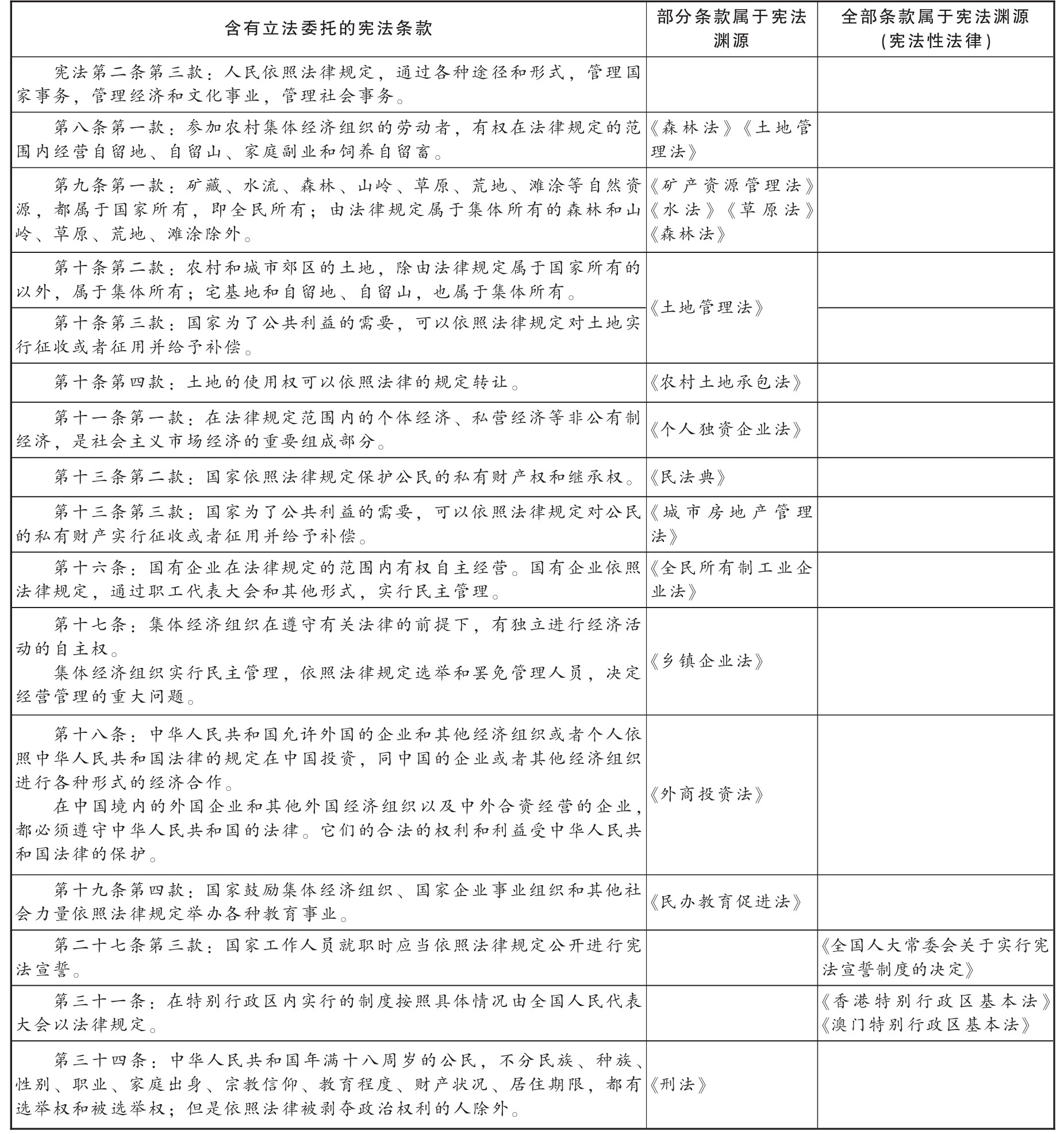目前关于宪法性法律的主要争论在于它到底包含哪些法律,其范围是不明确的。对此,笔者认为,如果从宪法性法律作为对宪法典的补充作用来看,宪法性法律应当局限在宪法典进行了立法委托的法律上(如下页表所示),因为这些法律承担了具体化宪法典的任务。在某种程度上,离开了这些法律,会影响合宪性审查说理的完整性。比如《宪法》第十三条第三款,国家为了公共利益的需要,可以依照法律规定对公民的私有财产实行征收或者征用并给予补偿。此时如果不看相关法律的内容,就无法判断国家的征收征用行为是否符合《宪法》第十三条第三款。因此,笔者认为,宪法性法律与宪法典的关系之所以比其他法律密切,就在于宪法性法律是宪法典直接进行立法委托的结果,或者说,宪法典的部分内容是由这些法律来具体化的,由此才使得它们在合宪性审查中的作用如此重要。比如2009年有公民针对国务院《城市房屋拆迁管理条例》向全国人大常委会提出审查建议。全国人大常委会法工委经审查认为,“《条例》将拆迁法律关系定位为取得房屋拆迁许可证的单位与被拆迁房屋所有人之间的关系,这与《宪法》《城市房地产管理法》等法律规定的征收作为国家与被征收人之间的行政关系不一致”。之所以将《宪法》与《城市房地产管理法》并列,就在于我国《宪法》第十三条第三款规定,国家为了公共利益的需要,可以依照法律规定对公民的私有财产实行征收或者征用并给予补偿。即宪法授权法律来规定征收征用公民私有财产的程序,而《城市房地产管理法》就是《宪法》第十三条第三款授权的产物。此时,《城市房地产管理法》发挥了帮助理解《宪法》第十三条第三款中“依照法律规定”的作用。这类似于意大利的“介入规范”。在意大利,介入规范是宪法学者创造的一个概念,用来指那些宪法裁判中仅仅间接作为合宪性标准的规范,因为这些规范介乎宪法典的标准和被审查的条款之间。这种介入规范主要存在于普通法律中,但是得到了宪法典的支持,比如宪法典要求必须尊重这些规范。在2001年之前,介入规范主要是授权政府立法的法律,它们被用来评估因此产生的政府立法的合宪性。
