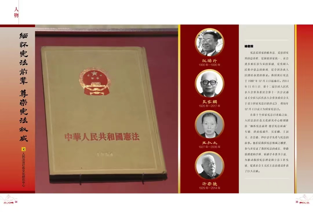 尊崇宪法权威”专题,讲述钱端升、吴家麟、王叔文、许崇德、四位法学先辈与宪法的故事。他们是我国宪法领域之翘楚,参与并见证了我国宪法的成长,筚路蓝缕建构学科,躬耕学术著书立说,为推动我国宪法理论和立法工作发展,促进社会主义民主法治建设作出了巨大贡献。