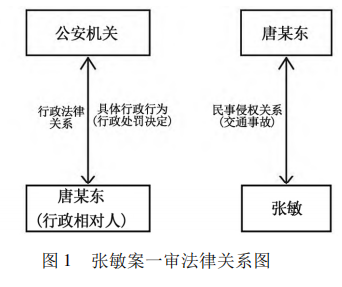 “张敏案”是我国最早出现的指令型行政辅助案例,该案中相关主体法律关系的辨明经历了三个层级法院的审判研究,以此为例可以窥见法院对于依据指令参与行政的私主体身份认识的“层层递进”,也直观展现了主体身份认定与责任性质的关系。一则,内蒙古自治区通辽市科尔沁区人民法院(以下简称“一审法院”)认为“原告所受各项损失是唐某东违章驾驶行为直接所致”,被告对唐某东作出的行政处罚与原告并无实际影响,因此原告不具备行政诉讼主体资格。换言之,一审法院认为唐某东对于公安交警而言是行政相对人,对于原告张敏而言是纯粹的私主体,因此唐某东有权对行政处罚决定提起行政诉讼,但张敏与唐某东之间的交通事故只能提起民事侵权诉讼,二者相互独立。(详见图1)