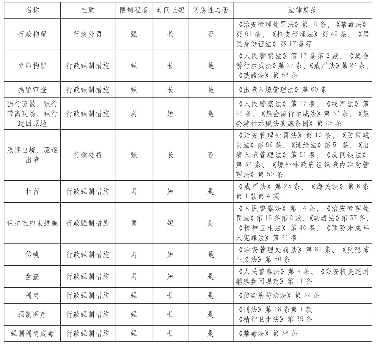 表1 行政法上人身自由的限制名称、性质及法律规范