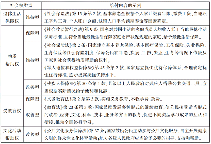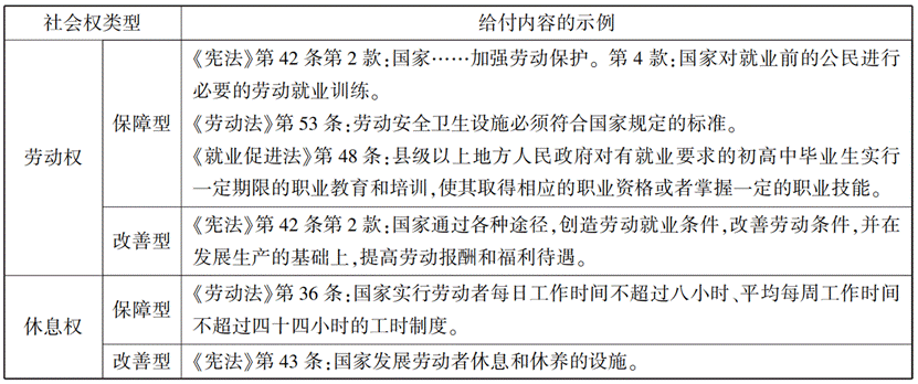 当然,上述分类只是一种理想类型,现实中的社会权较少为纯粹的单一类型,更多是混合型。比如劳动权中,既有保障型社会权的内容,像提供最低劳动保护和必要的就业训练,也有改善型社会权的内容,像“创造劳动就业条件,改善劳动条件,并在发展生产的基础上,提高劳动报酬和福利待遇”。受教育权中,国家提供免费义务教育属于保障型社会权的内容,而“国家培养青年、少年、儿童在品德、智力、体质等方面全面发展”则属于改善型社会权的内容。笔者结合我国宪法和有关法律法规的规定,对我国宪法上的社会权类型作如下的总结,如下表所示: