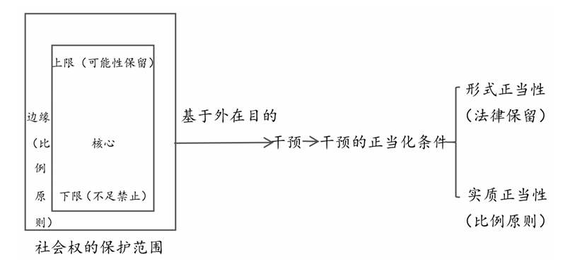如果立法是基于外在目的对社会权的保护范围进行限缩,就构成了立法干预。但问题是,这种干预必须具备正当性。因为原则上,处于保护范围内的行为既然要受保护,就不应当再对其进行干预。与对自由权的干预类似,对社会权的干预也要具备形式正当性和实质正当性。形式正当性是对干预社会权的立法在权限和程序上的要求,这里比较关键的问题是,干预社会权是否要实行法律保留?即干预社会权的立法是否必须为全国人民代表大会及其常务委员会的法律?对此,有学者提出反对理由,包括:①我国《立法法》第11条规定的只能制定法律的事项中并未包含社会权,而主要是针对人身自由、政治权利、财产权等自由权。②2016年《国务院关于推进中央与地方财政事权和支出责任划分改革的指导意见》(国发[2016]49号)中规定,“要逐步将义务教育、高等教育、科技研发、公共文化、基本养老保险、基本医疗和公共卫生、城乡居民基本医疗保险、就业、粮食安全、跨省(区、市)重大基础设施项目建设和环境保护与治理等体现中央战略意图、跨省(区、市)且具有地域管理信息优势的基本公共服务确定为中央与地方共同财政事权,并明确各承担主体的职责。”可见,教育、文化、社会保障、就业等基本公共服务属于中央和地方共享的财政事权,即中央和地方的立法都可以对社会权进行调整。③全国人民代表大会常务委员会法制工作委员会法规备案审查室曾指出:“根据立法法第八条的规定,有关独生子女父母养老补助和产假、护理假待遇等规定,不属于国家法律保留事项,属于地方自主立法范畴。”④立法机关的预算计划只是给出了一般性的支出目的,比如对于促进就业安排4000万人民币的预算,但是这4000万如何分配,包括给何人、给多少、在什么条件下给,都需要细化。而细化的工作并不适合由立法机关来决定,更多是由行政机关根据实际情况来确定,只要整体上没有超出预算计划即可。同时,一些紧急情况,尤其是社会救助领域,比如灾害救助、事故救助等,往往是突然发生的,立法机关不可能事先预见到,因此由行政机关来紧急处置更为适宜。但是也有学者提出支持观点,认为对社会权的干预——拒绝给付,其对当事人的影响不亚于对自由和财产的干预,比如拒绝补助将导致企业的生存受到威胁,拒绝给奖学金可能导致学生的学业中断,所以,拒绝给付应当获得法律的授权。